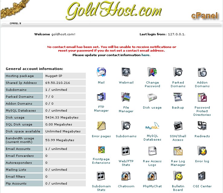 Gold Host offers 1 Linux Cpanel 10 Web Hosting accounts, (For Windows server hosting, click here.) all payable by Visa, Mastercard, Discover, American Express, check or money order. Click here to order.